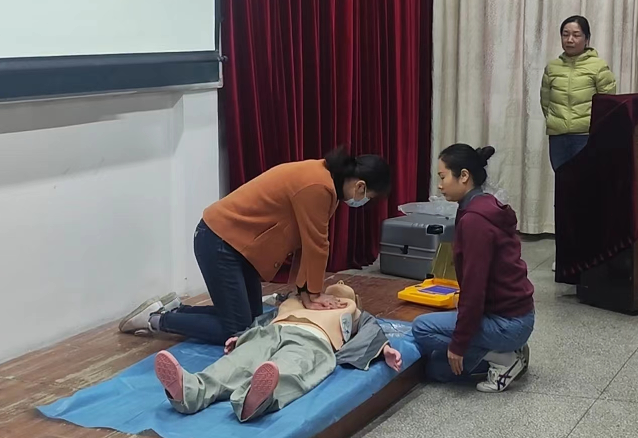 最后一项是心肺复苏与电除颤的培训。心肺复苏术是医务人员进行院前、院内急救必须掌握且要熟练应用的一项基本技能。长期在一线从事急诊救治工作的综合内科董琳副主任从理论知识和实践操作两部分给大家完整的讲解了CPR(心肺复苏)的基本知识、急救处理流程、急救常识以及心肺复苏术操作中需要注意的环节等。为了加深大家的印象,董琳主任还邀请内科和急诊科两位优秀的护士演练了整个急救操作流程,包括呼叫急救电话、口对口人工呼吸、胸外按压和自动体外除颤器(AED)的使用。